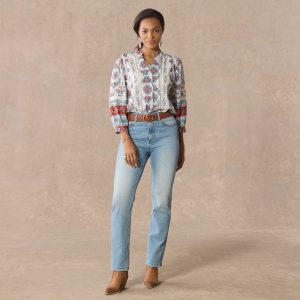 Our easy. mixed print shirt with a beautiful border print is complete with feminine pintucks and lace trim insets at the center front. Three-quarter sleeves. Shirttail hem. notch neckline. Cotton. Machine wash. Imported. Exclusive. Sizes XS (0??). S (4??). M (8??0). L (12??4). XL (16??8). XXL (20??2). Approx. 25.5l.
