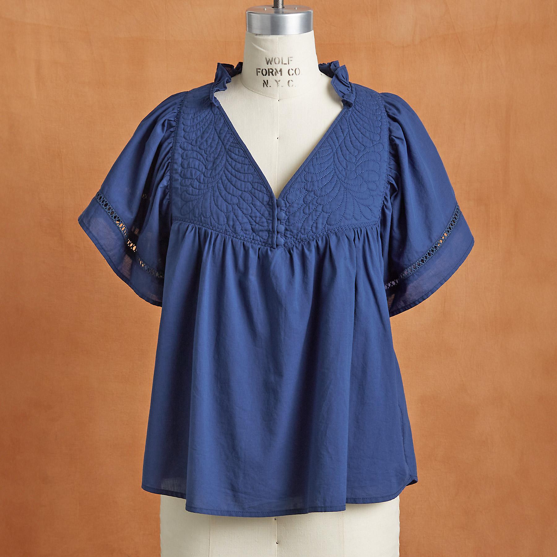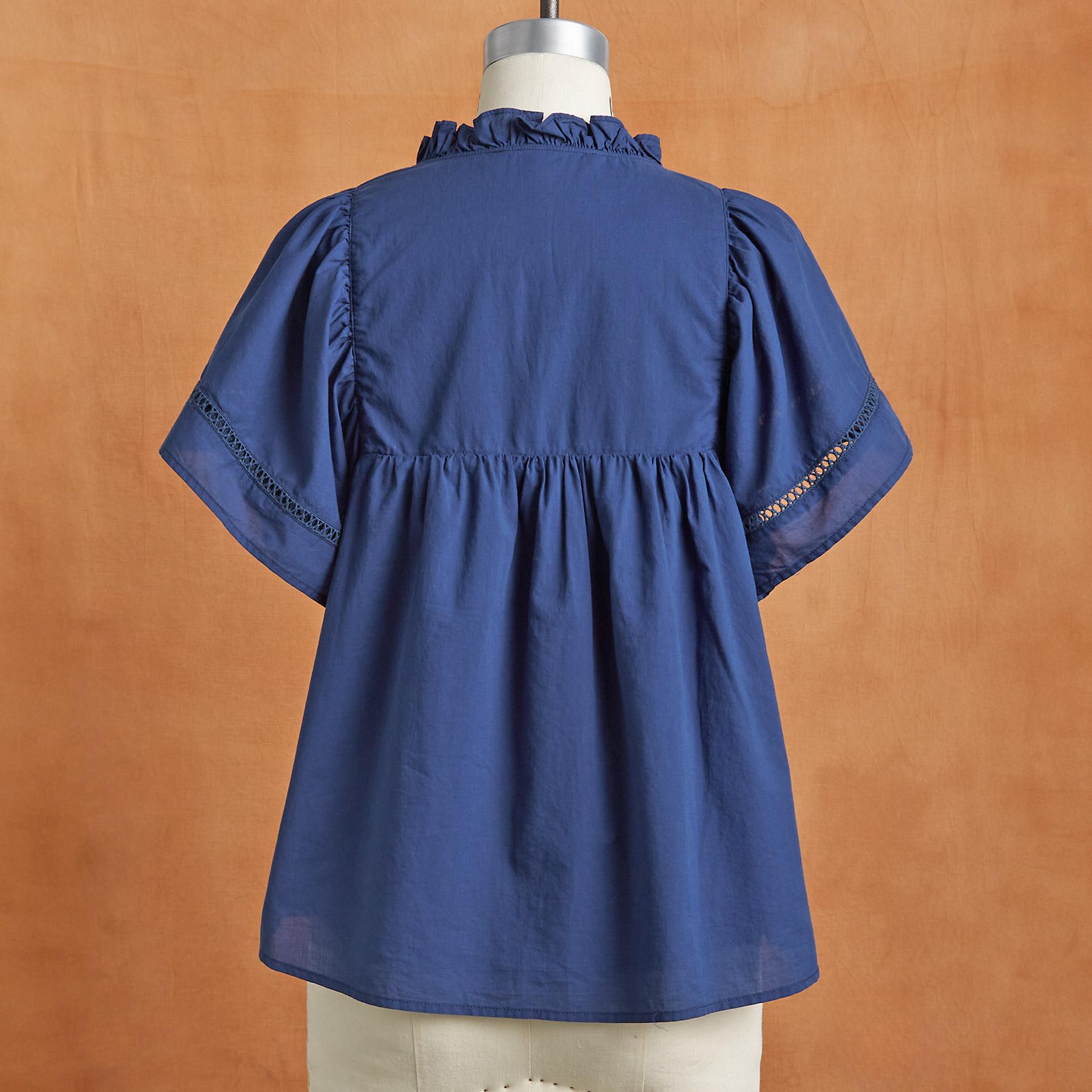 So stylish. our easy notch neckline top features feminine flutter sleeves with ladder lace insets. three buttons at the placket. special embroidery detail and ruffles at the neckline. Cotton. Hand wash. Imported. Sizes XS (0–2). S (4–6). M (8–10). L (12–14). XL (16–18). XXL (20–22). Approx. 23.75l.