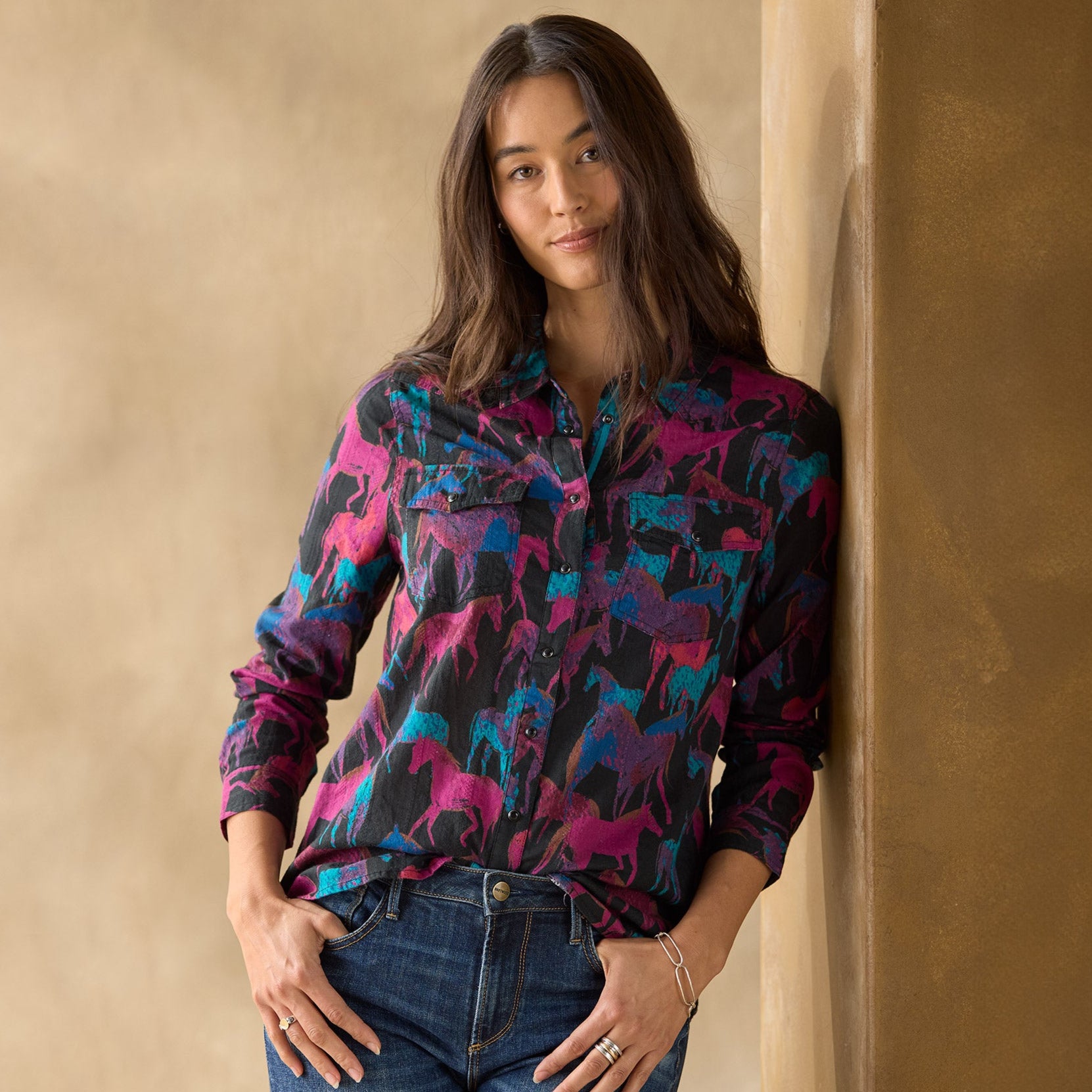 Western-inspired. pearlized snap front shirt in the prettiest cotton dobby with equestrian print. Two chest pockets. lace detail at back neck. grosgrain ribbon at placket. Western back yoke and shirttail hem. Machine wash. Imported. Exclusive. Sizes XXS (00). XS (0?C2). S (4?C6). M (8?C10). L (12?C14). XL (16?C18). Approx. 25l.