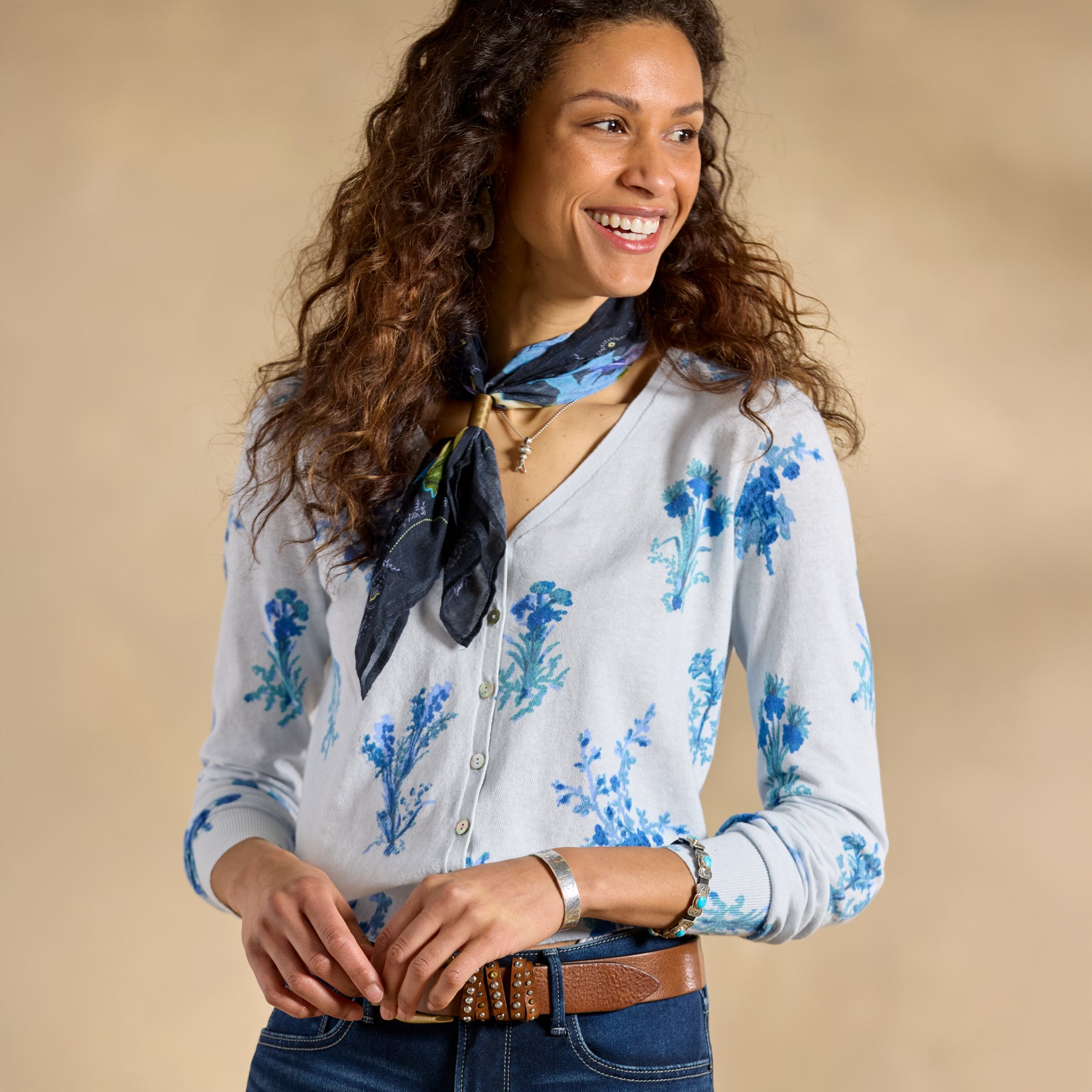 A woven garden party. the Larkspur Cardigan features a flattering fitted shape in a featherweight knit festooned with a feminine floral print. Cotton/linen. Hand Wash. Imported. Exclusive. Sizes XXS (00). XS (0–2). S (4–6). M (8–10). L (12–14). XL (16–18). Approx. 20l.