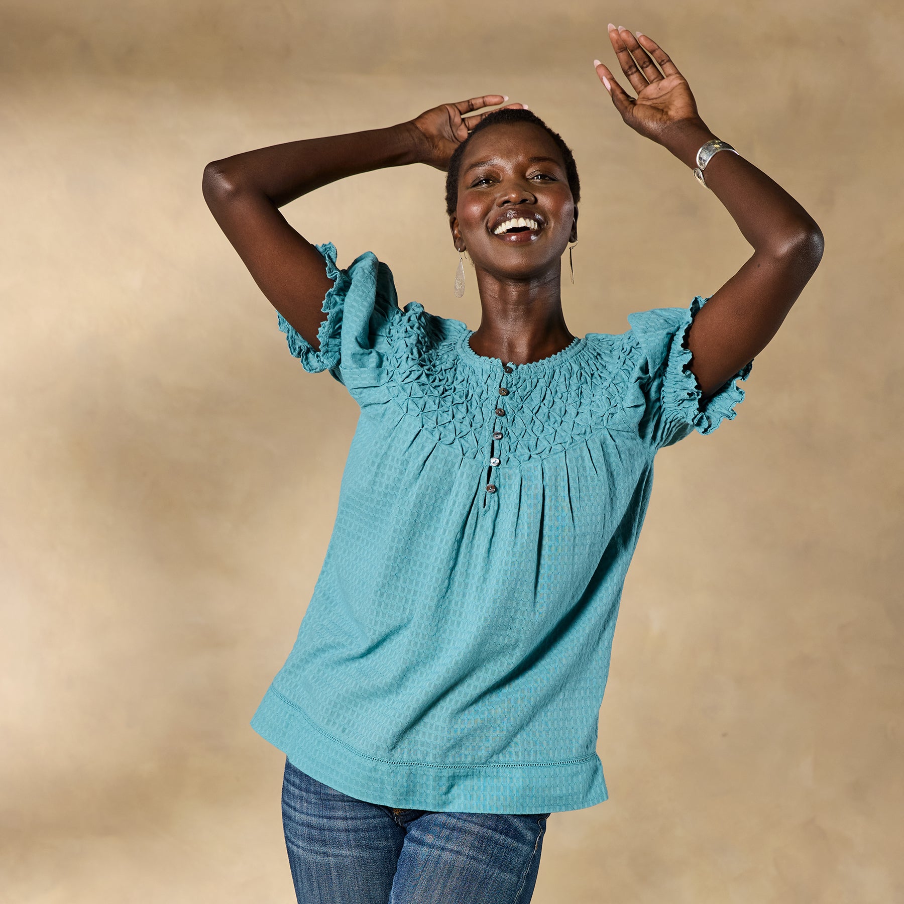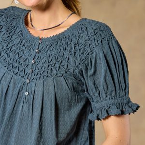 Feminine and textured. our Lodi Top is designed in bold colors with intricate details of lace and pineapple smocking. Button placket with loop closure. Elastic cuffs. Cotton. Machine wash. Imported. Exclusive. Sizes XXS (00). XS (0?C2). S (4?C6). M (8?C10). L (12?C14). XL (16?C18). Approx. 22.5l.