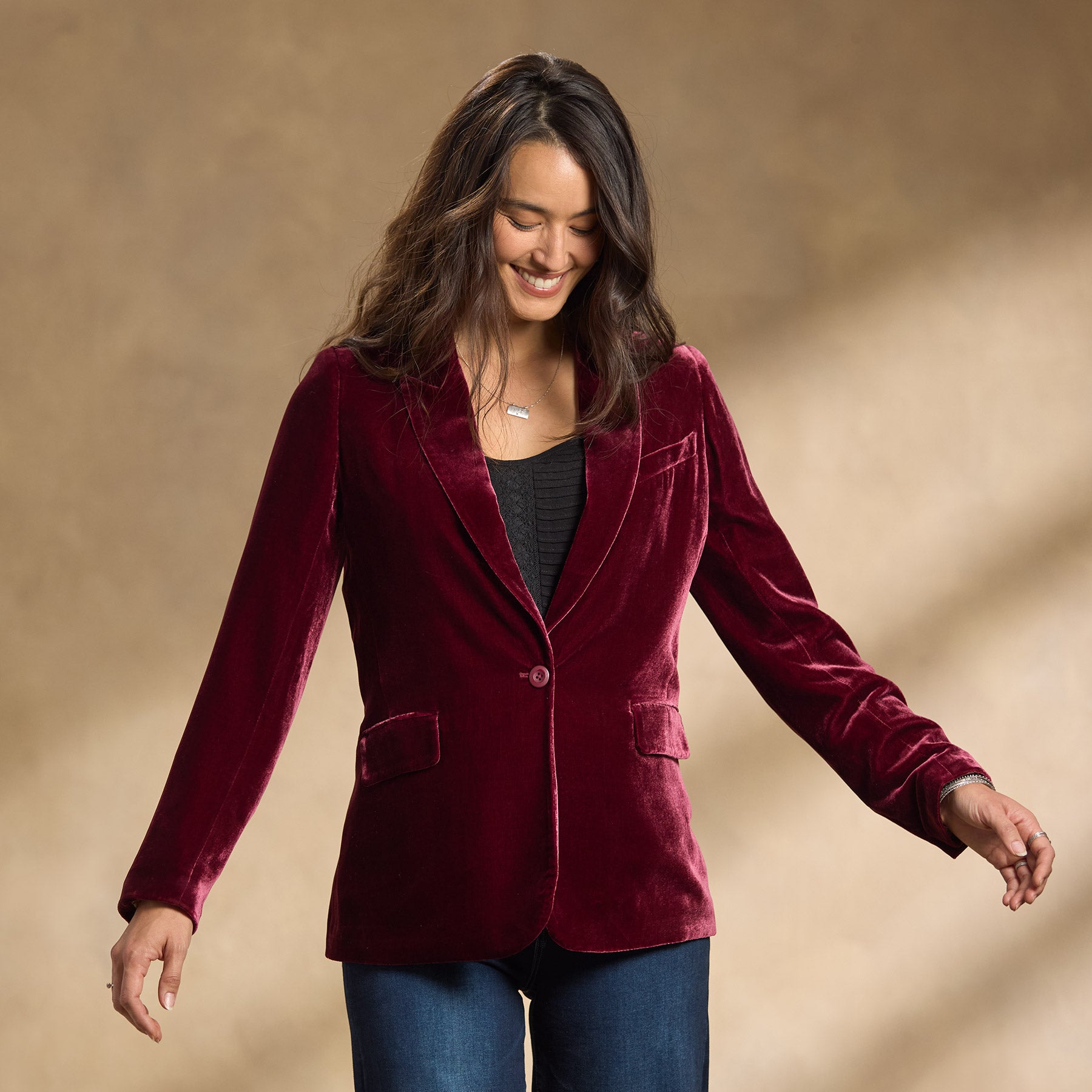 Our easy velvet blazer in a classic fit boasts a pretty vintage lining in blooming florals. back vent and four button cuffs. Two pockets with flap closure. Viscose/silk. Dry clean. Imported. Exclusive. Sizes 2-16. Approx. 28l.