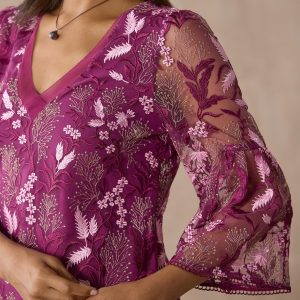 This stunning. above-the-knee shift dress is highlighted with rich colors. allover floral embroidery. bell sleeves. eyelash detail at the V-neckline. scalloped lace hem and a keyhole back. Polyester. Hand wash. Imported. Sizes XXS (00). XS (0 to 2). S (4 to 6). M (8 to 10). L (12 to 14). XL (16 to 18).
